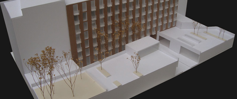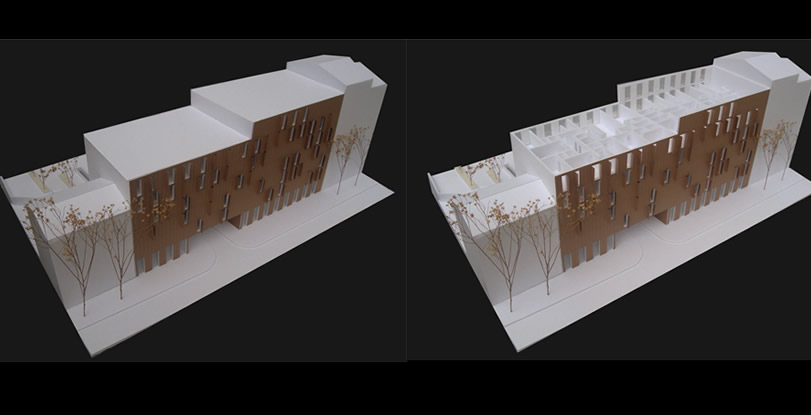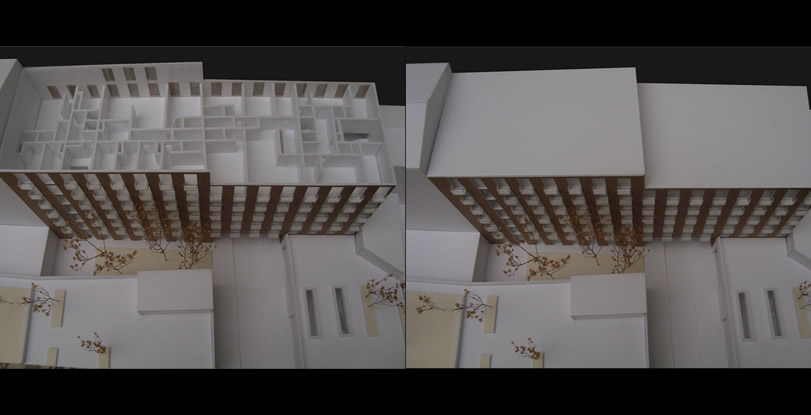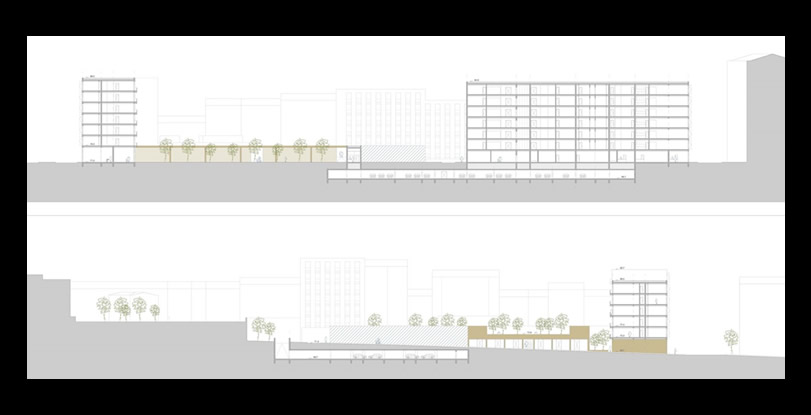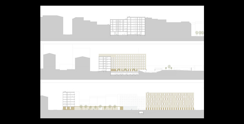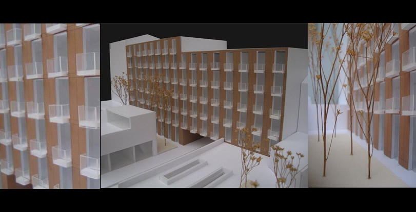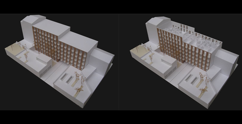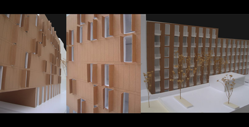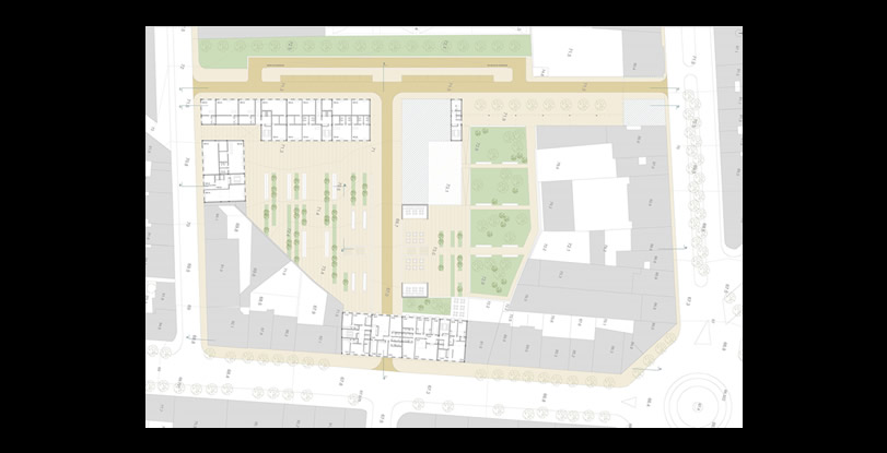 A proposta concentra-se no interior do quarteirão e pretende fechar as três frentes abertas pelo edificado envolvente, garantido no entanto a passagem para o seu interior, tanto a nível pedonal como viário. A passagem Norte e Nascente são efectuadas por baixo do edifício e a passagem Sul está a descoberto. O programa integra essencialmente blocos residenciais e ainda uma creche/ centro de dia com espaço exterior comum.